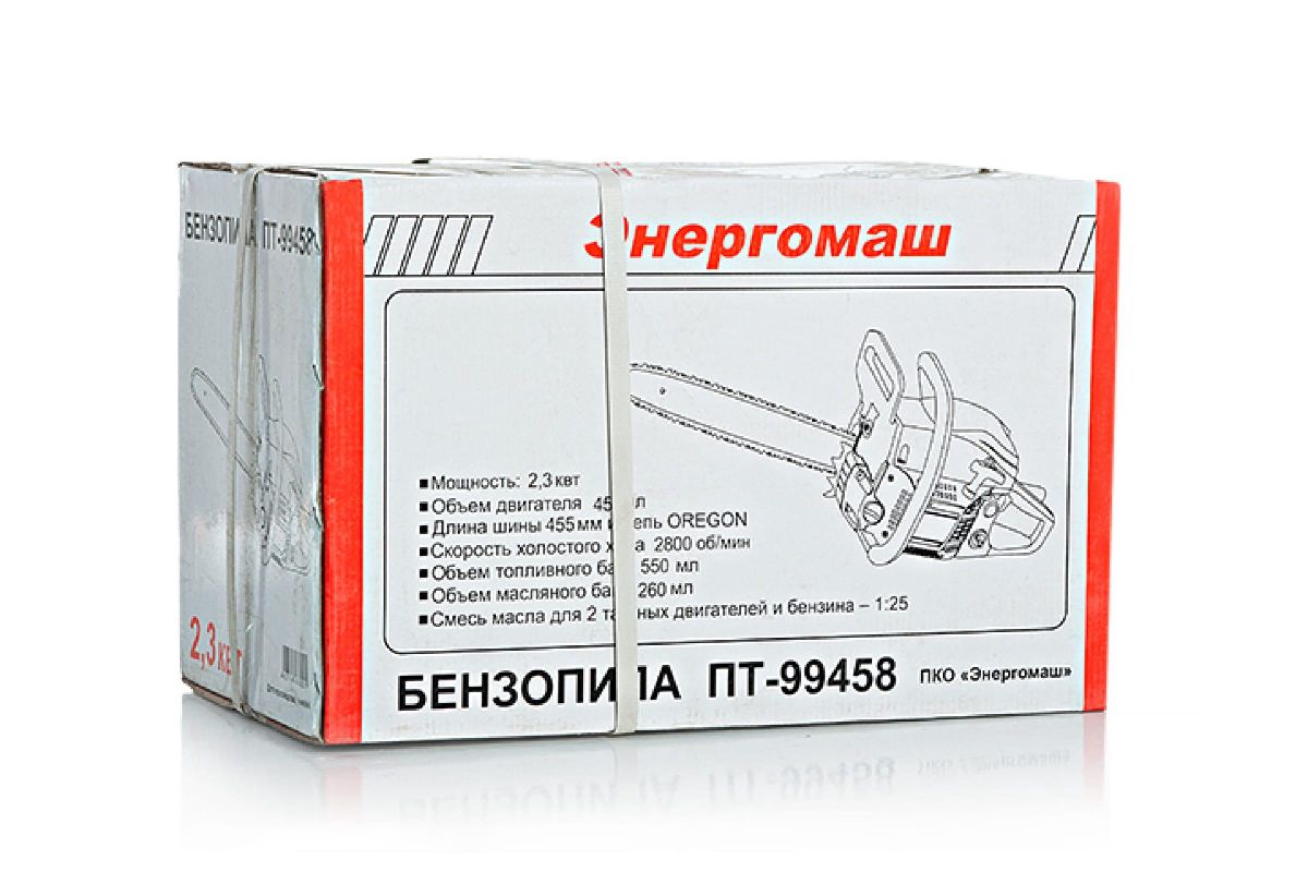 ЭНЕРГОМАШ ПТ-99458 – бытовая бензопила мощностью 2300 Вт. Двухтактный двигатель объёмом 45 см³ работает на бензомасляной смеси. Цепь содержит 72 звена по 0,325 дюйма и натягивается с помощью механизма на винтах.