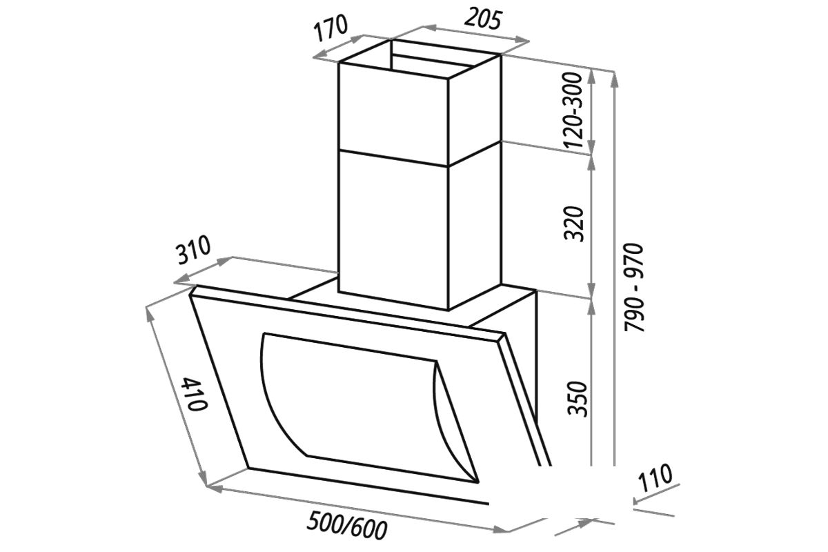 - Наклонная вытяжка монтируется на стену над поверхностью плиты;
