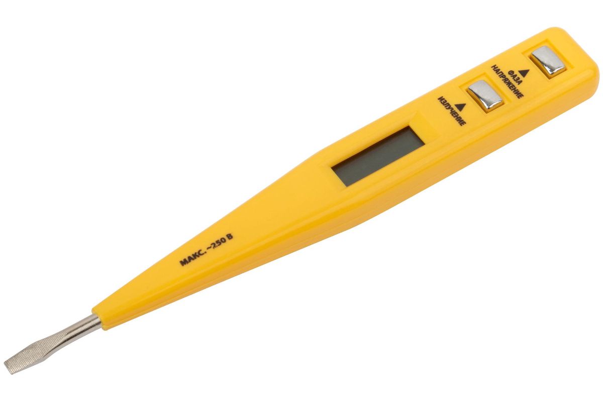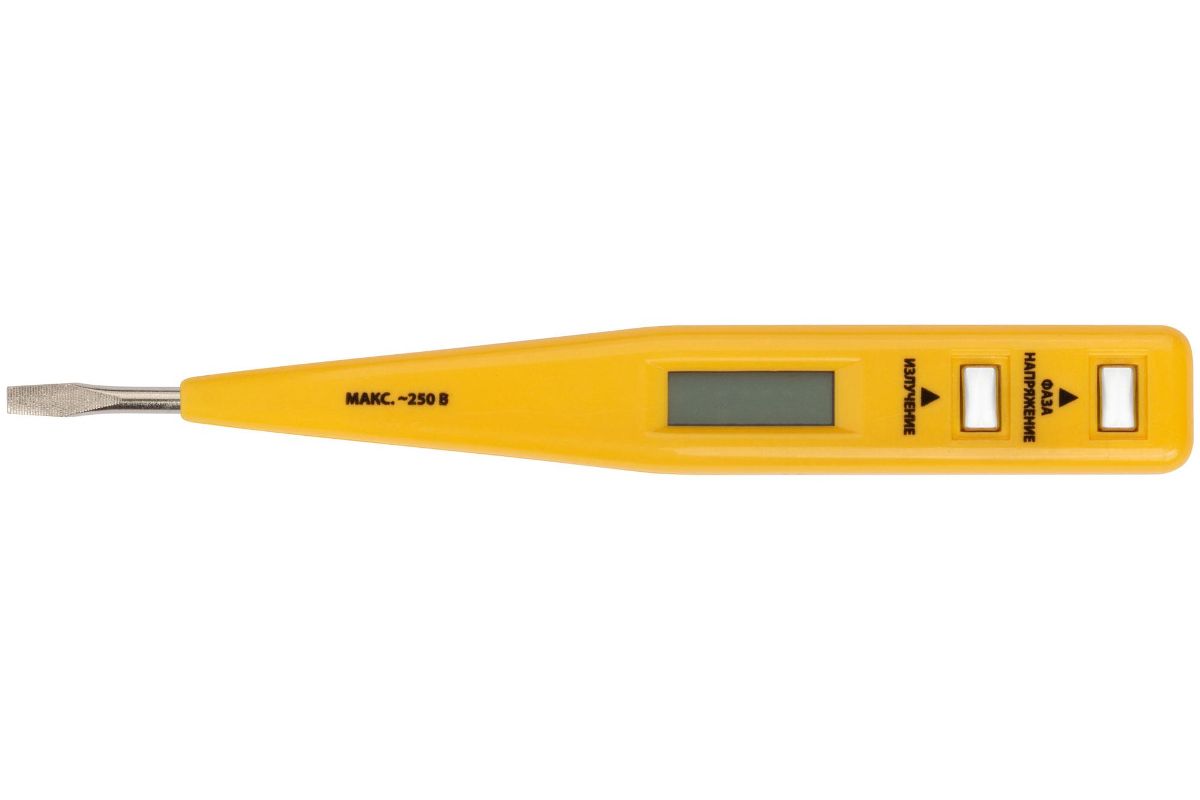 Для проверки наличия напряжения в электрической сети (от 12 до 220 В), поиска обрыва цепи, определения наличия электромагнитного излучения. ЖК-дисплей. Материал: металл, пластик.Упаковка: блистер.